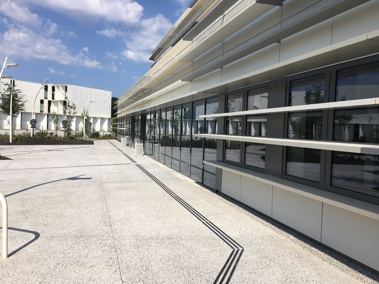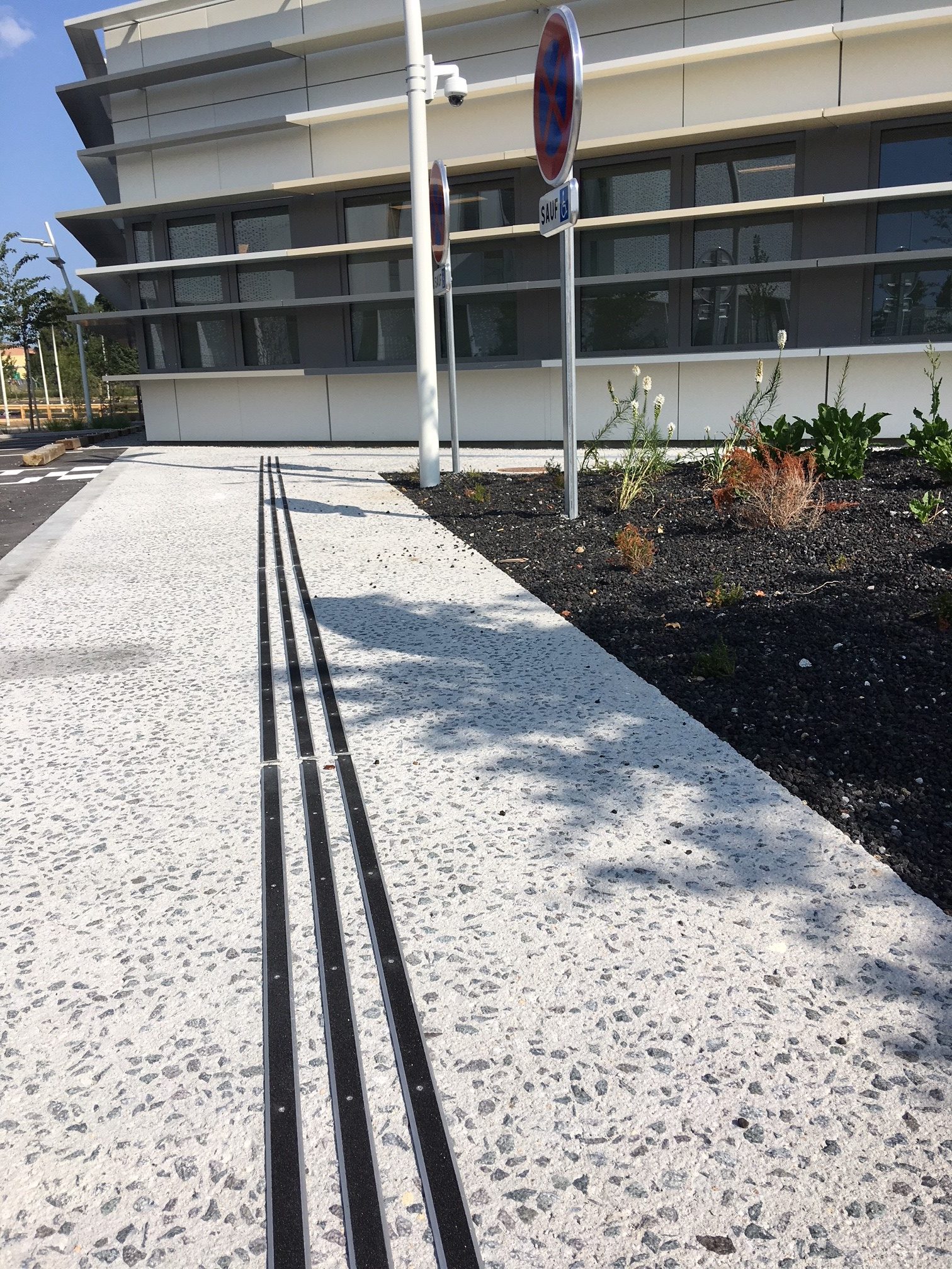Pose de profils de guidage pour les personnes malvoyantes en situation de handicap. Le profilé de guidage aluminium et minéral est insensible aux UV et aux intempéries. Il est très résistant au trafic intense et à la glissance sur sol humide.
