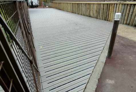 Afin de sécuriser le passage des usagers et d’éviter tous risques de glissade. Des profils antidérapants ont été posés sur cette passerelle en composite. Il s’agit de profils plats dans lesquels nous venons couler de la résine antidérapante qui sont ensuite visés sur place dans les lames de composite.